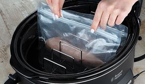 Looking to cook nutritious food that’s cooked just the way you like it? Whether it’s a perfectly cooked rare steak, a succulent salmon fillet or vegetables filled with flavour, you can do it all sous vide. So how does it work? 1) Add Sous Vide rack to sit within the ceramic pot. 2) Then simply add hot water and fill the ceramic pot to ½ way. 3) Press Sous Vide and adjust to desired temperature. 4) Load food into zip-locked bags. Slowly submerge into ceramic pot, to sit within rack and seal the bag. 5) Place lid on slow cooker and insert temperature probe into the water. 6) Press START to begin cooking.
