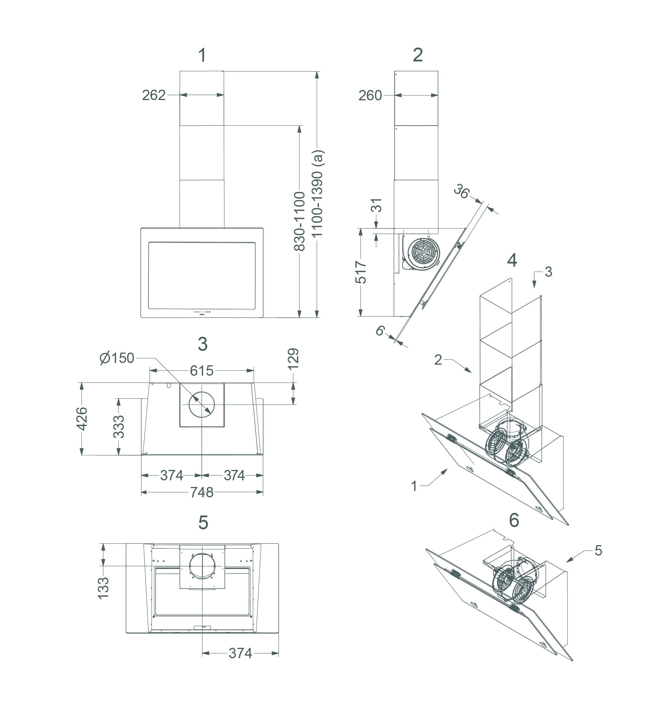- Product Dimensions Exhaust (Wxdxhmin-hmax) : 748 x 426 x 830 - 1100 mm