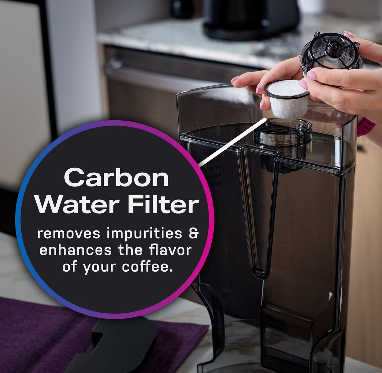 Achieve pure flavor extractions thanks to an innovative carbon water filter that conveniently reduce chlorine from water and remove odors to provide a clean water base for the highest quality coffee.