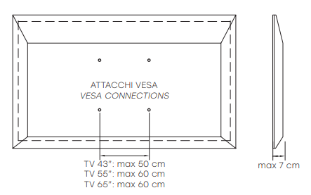The use of a flat screen TV is essential, with rear VESA connections and front frame without any projections. The customer is responsible for checking compatibility of his own TV with the mirror attachment system. Nuts and bolts and hardware for fixing the TV to the mirror frame are not supplied