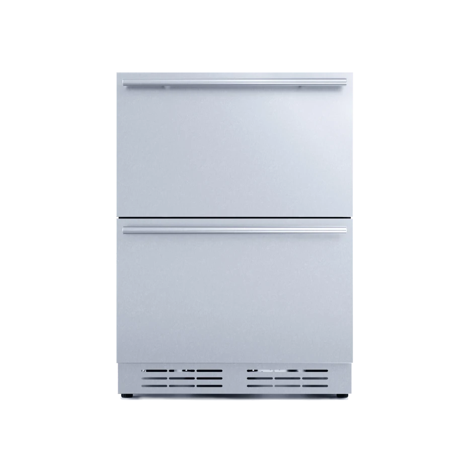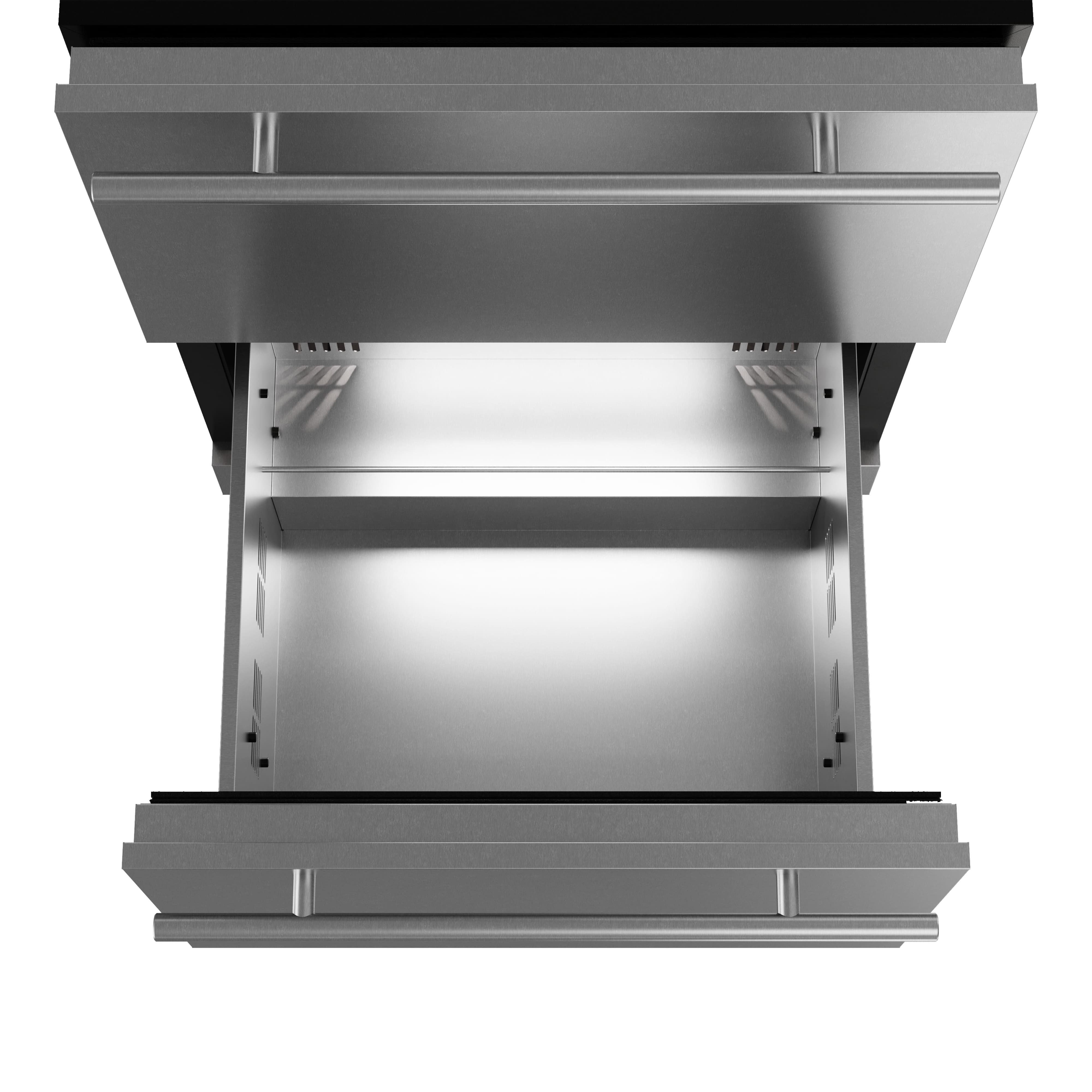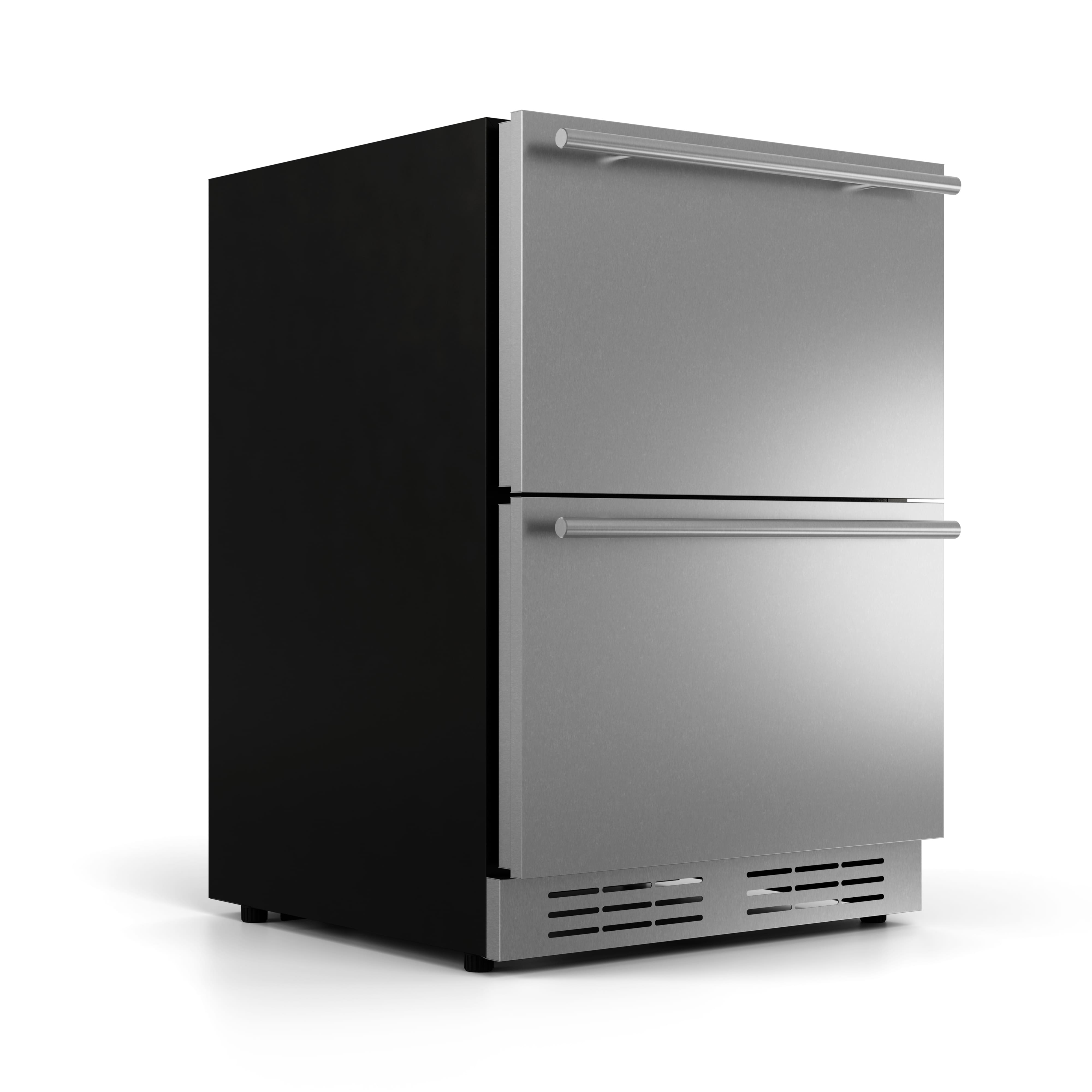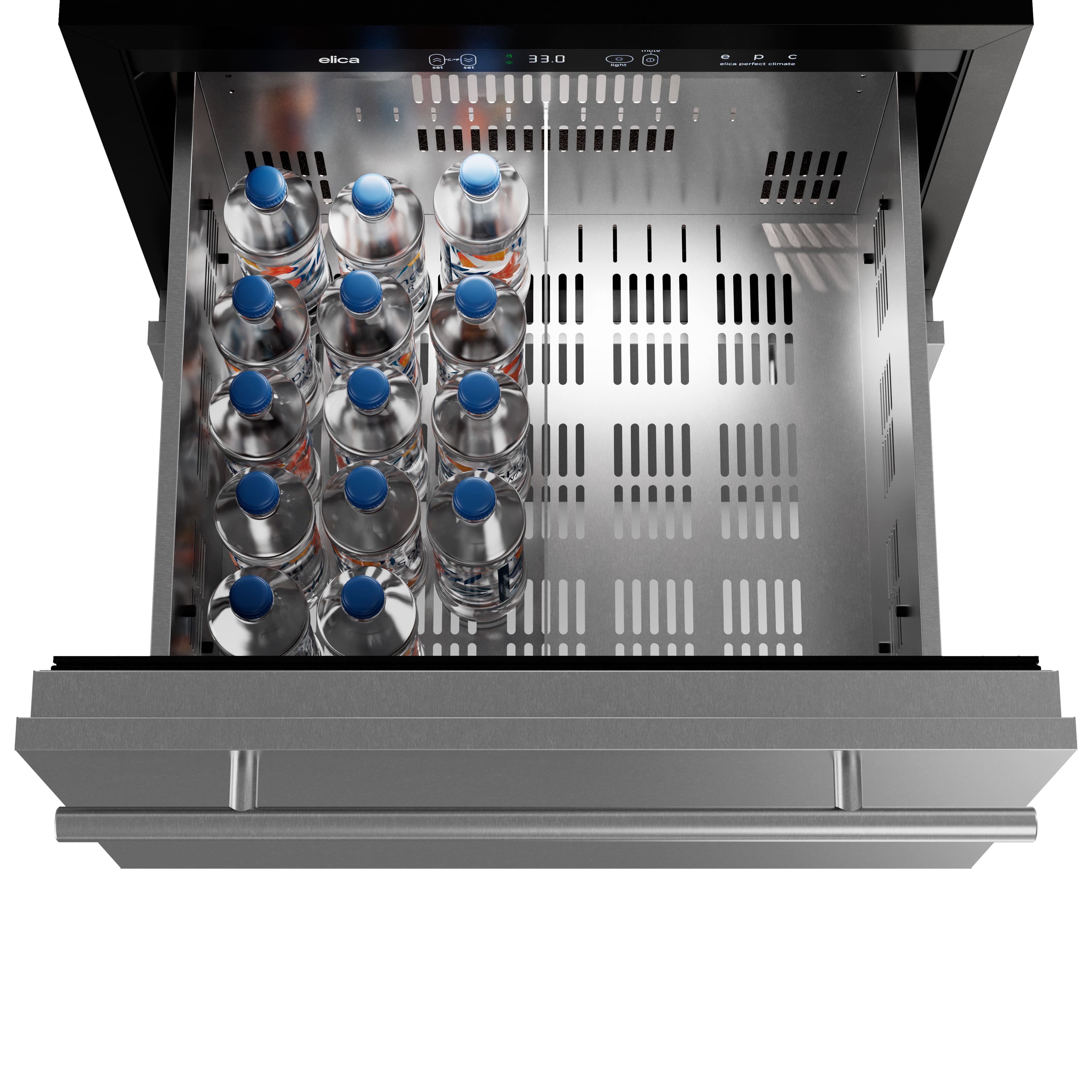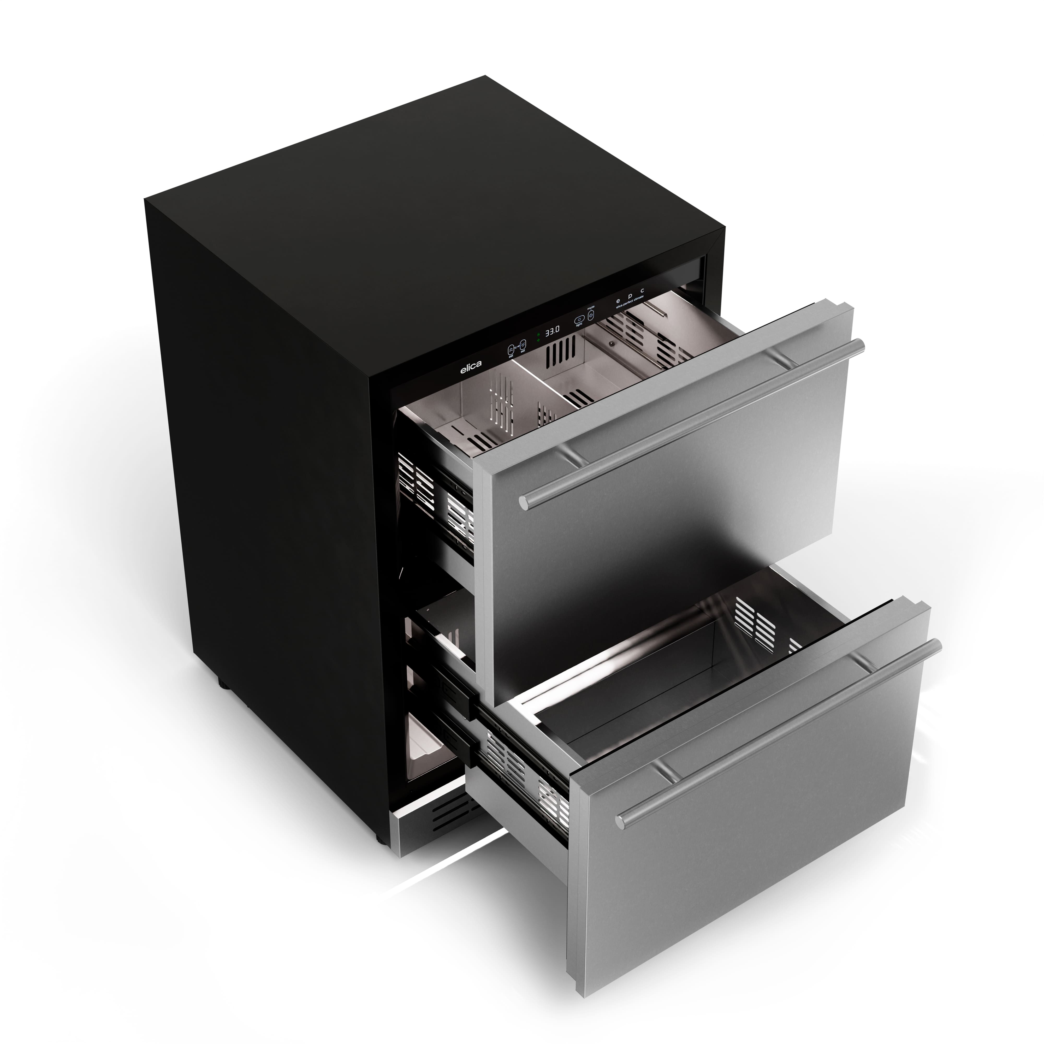 RISERVA - EBD51SS1 Is the perfect solution for your refrigeration needs. This Single Zone Double-drawer Unit comes with a Black Cabinet and 304 Stainless Steel solid doors and is designed to be Panel Ready Convertible, making it blend seamlessly into your kitchen cabinetry. The drawers are spacious and can accommodate up to 137 L. Featuring an electronic control panel with a white LED readout, providing easy access to temperature adjustments ranging from 34° to 64°. With its sleek design, this drawer unit is sure to add style and functionality to your kitchen.